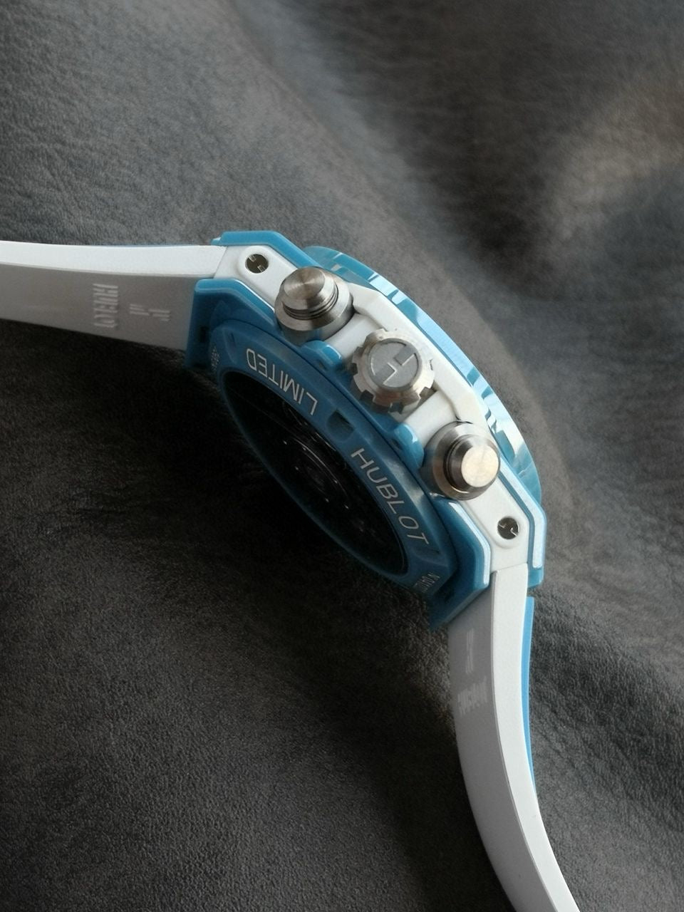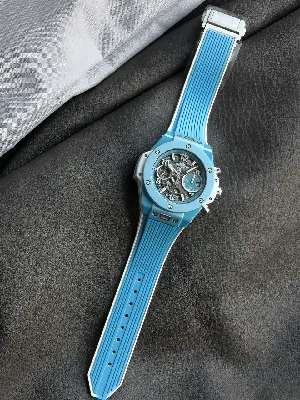 Experience bold luxury with the Hublot Big Bang Unico Blue Ceramic Chronograph, a statement timepiece crafted for those who demand performance and prestige. Featuring a Full Ceramic Case, a skeleton dial crafted of 100% titanium to reduce weight, this model blends cutting-edge materials with modern design. The tourquise chronograph sub-dials, and white accents enhance visibility and sport appeal, while the durable black rubber strap ensures comfort and versatility.